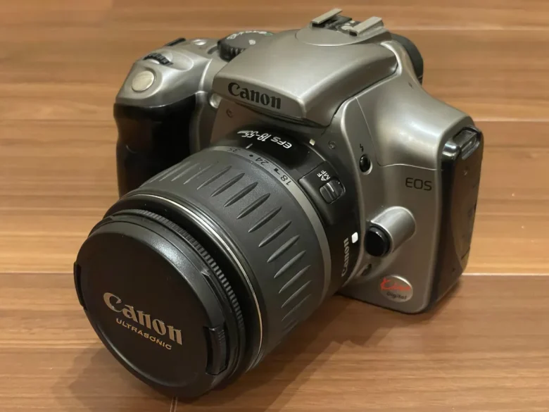 まずはこちら。2003年発売、デジタル一眼レフを一般家庭に普及させた歴史的モデル、「初代キスデジ」です。