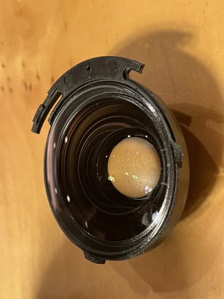 …私は正直、電気系統の修理はムリです(過去に二度破壊歴あり)。カビやクモリの除去も、特に新しいレンズは深部まで分解する必要があり難しいのですが、今回は物理的な破損で、しかも電気回路のない前方だけ!
