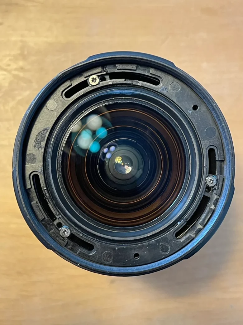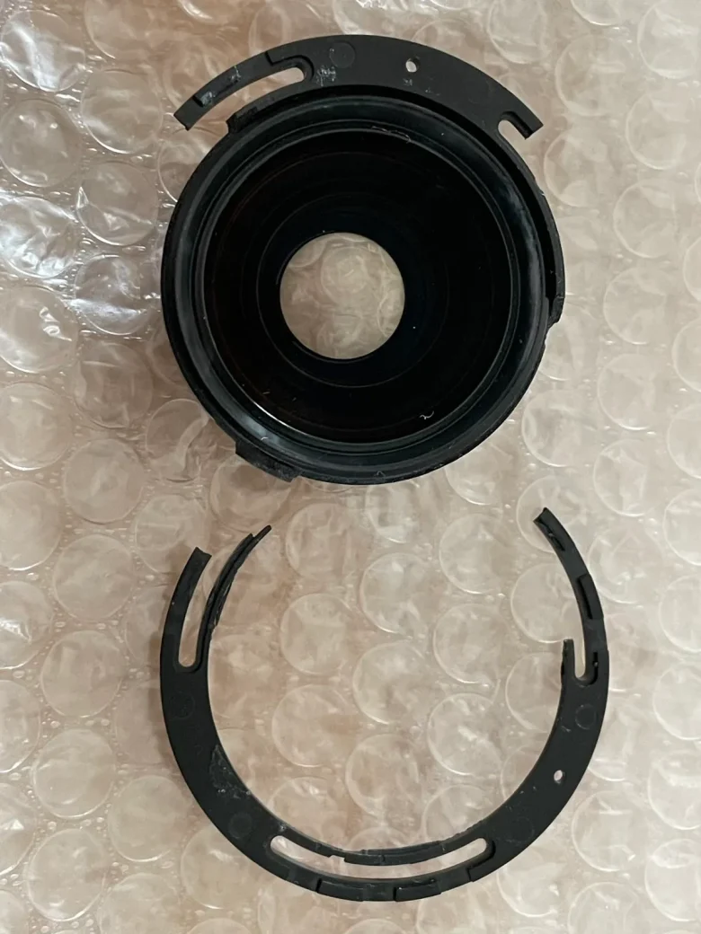 ところが、今回のレンズは全く別の要因です。プラスチックの枠が折れて、前玉ユニットごと沈んでしまっただけというシロモノ。