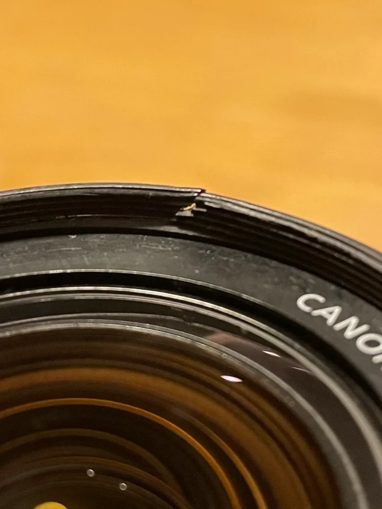 よく見ると、鏡筒の先端「枠部分」が折れていました。”道中”のレンズの写真を見返すと、明らかに歪んでいるのですが、前玉に夢中で全く気付いておりませんでした(笑)。